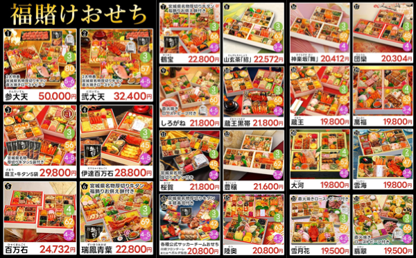 平均価格21,839円の対象おせち料理32種類の中からランダムにおせち料理が届く、福賭けおせち福袋。14,800円~50,000円相当の高額おせちを含むいずれかひとつを、何が届くかお楽しみの福袋形式でお届け。どれが届いても通常売価の半額以下のお値打ち価格。 見込みが外れて大幅に作りすぎてしまい、ダダ余りのおせち料理の在庫処b……ではなく、「 お客様視点に立った質の高いおせち料理の開発や、接客サービスを実現するための取り組みとして、製造する一部のおせち料理をモニターキャンペーン特別価格にてご提供いたします」とする品。注文後のキャンセルはできないので、年末年始に旅行などを計画している人は気をつけて。